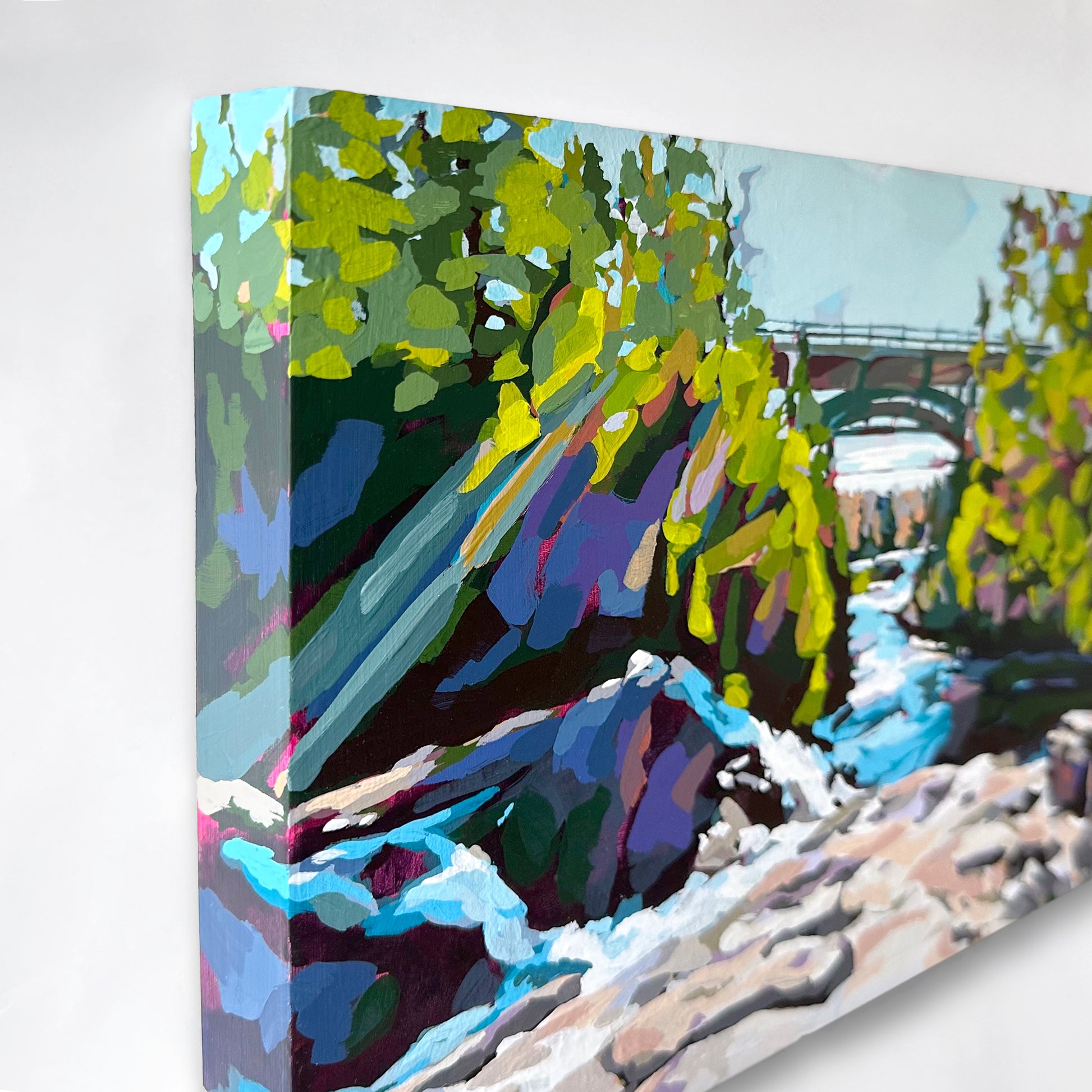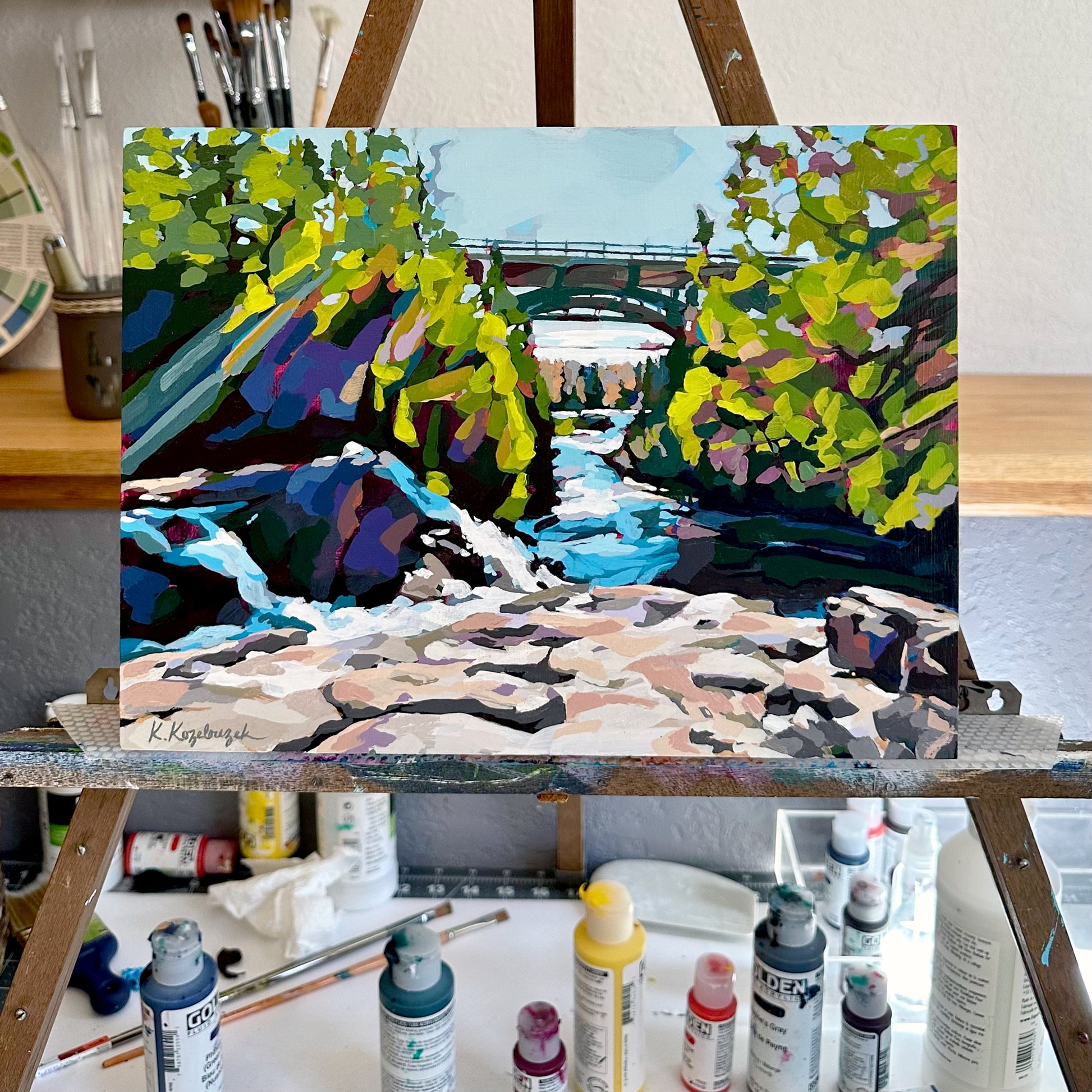 Experience the beauty of "Gooseberry Upper Falls" with this original 12"x 9" x 1.5" acrylic painting on basswood panel by Kristen Kozelouzek. The painting's edges feature a seamless wrap, allowing it to be displayed without a frame. Signed on the front and titled on the back, this piece is ready to hang and is perfect for adding a touch of the North Shore to your space – creating a peaceful escape to enjoy everyday.