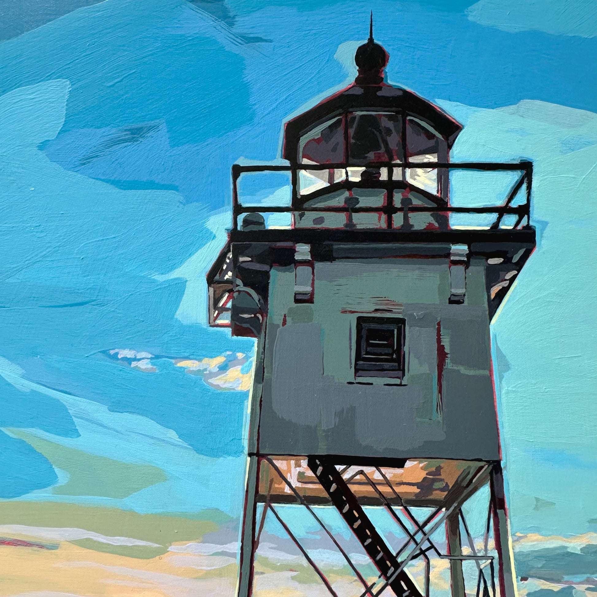 "Grand Marais Lighthouse" is an original acrylic painting by Kristen Kozelouzek on basswood panel measuring 12" x 12" x 1.5". The painting wraps around the edges and can be displayed without a frame.