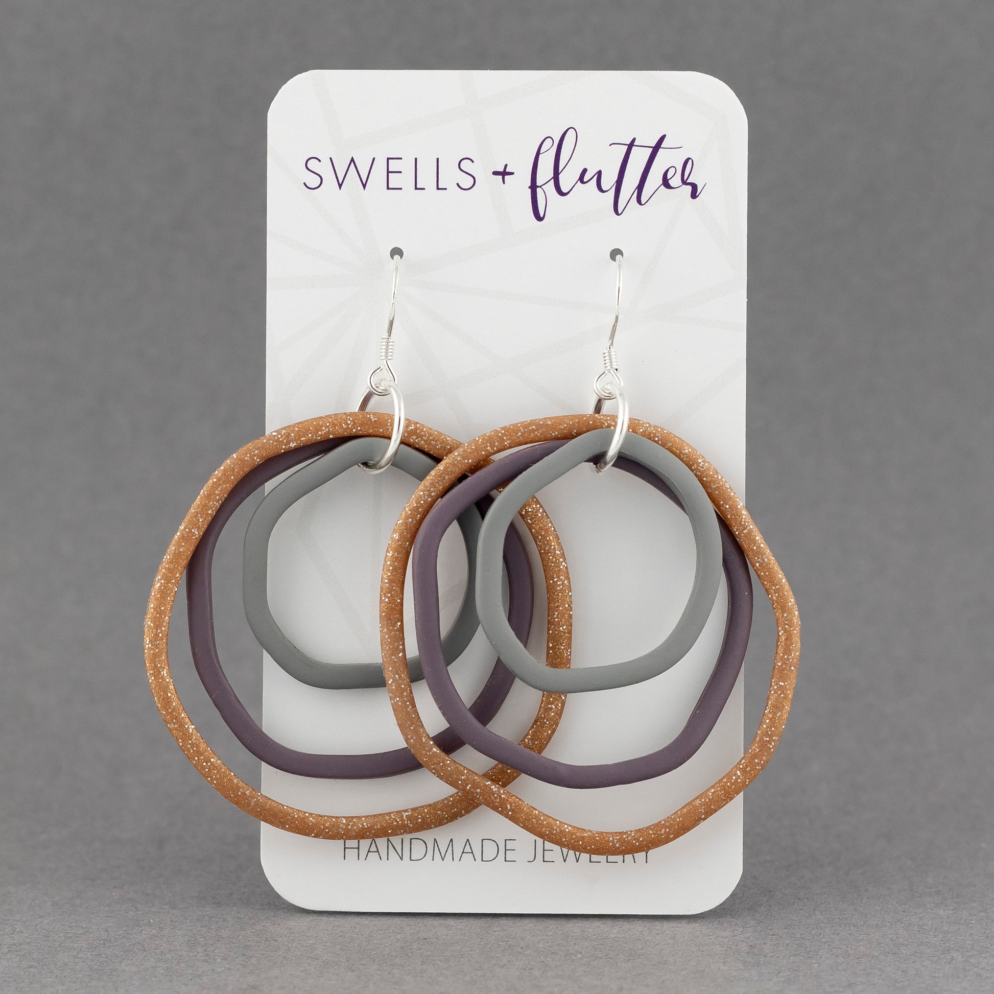 Layered hoop drop earrings in soft purple, gray & rose gold sparkle.