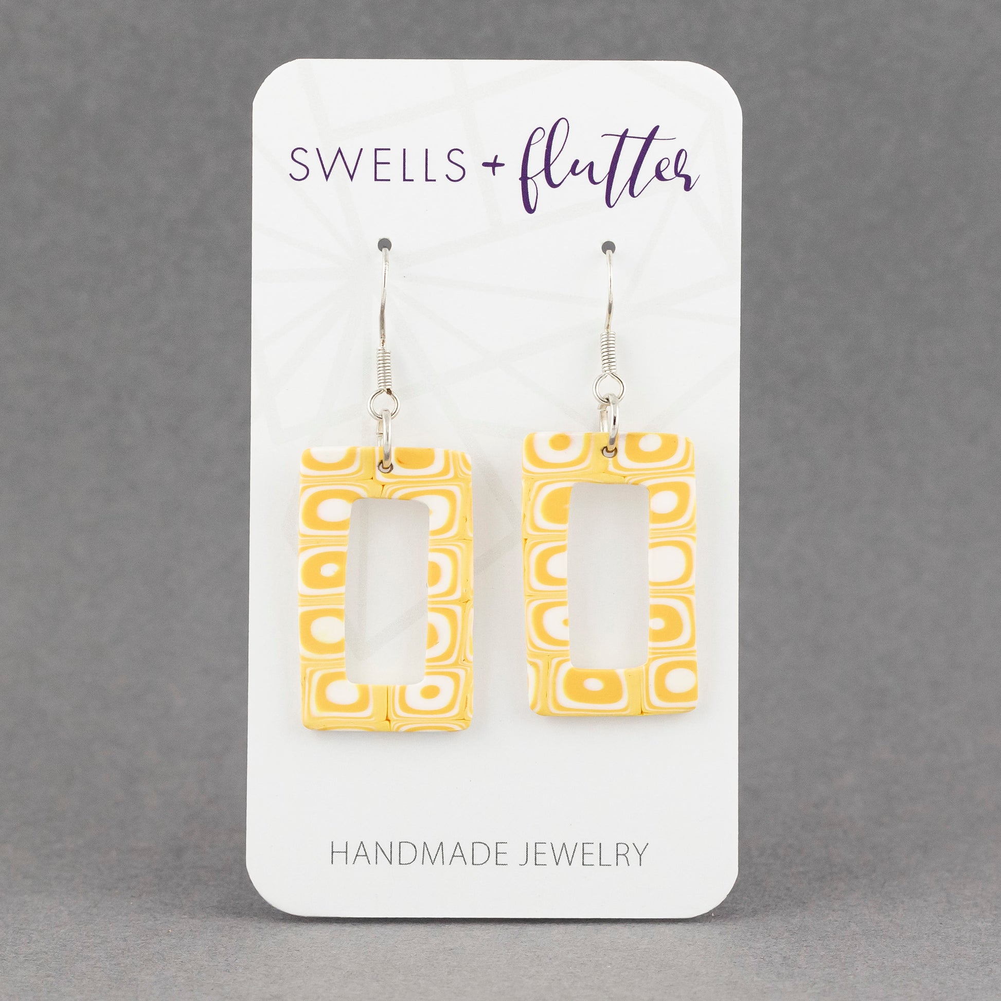 Rectangle drop earrings with a yellow & white geometric pattern.