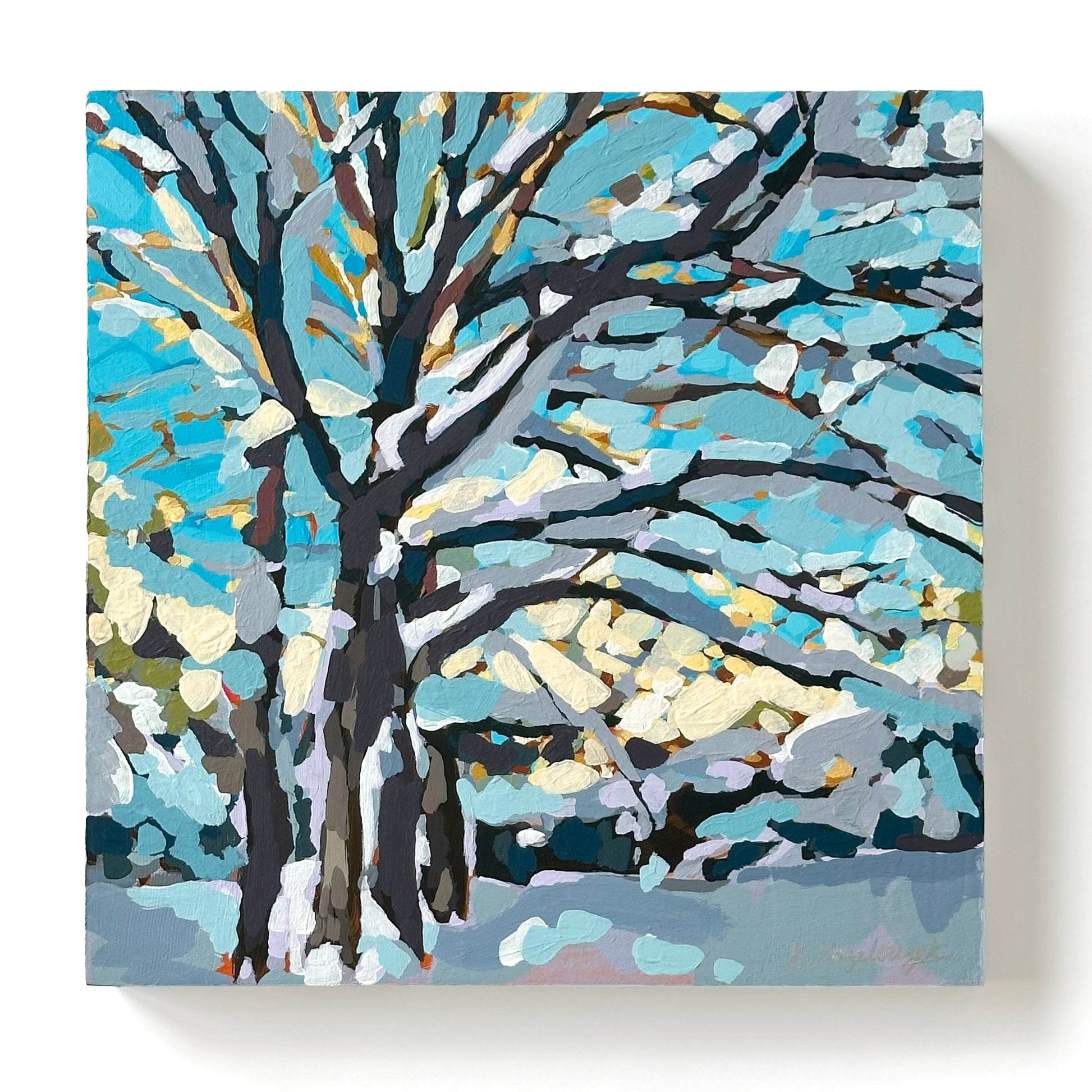 "Winter Tree" is an original acrylic painting by Kristen Kozelouzek on basswood panel measuring 8" x 8" x .75". The painting wraps around the edges and can be displayed without a frame.